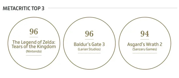 根据评分网站 Metacritic,今年口碑最佳的三款游戏分别是《塞尔达传说:王国之泪》、《博德之门3》和《阿斯加德之怒2》。其中《王国之泪》和《博德之门3》并列第一,均获得 96 分综合评价的好评。
