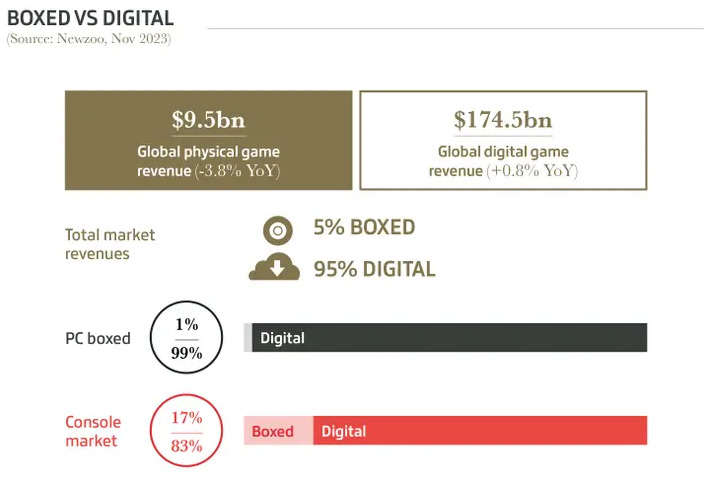 而根据实体和数字游戏区分市场,实体游戏仅占 5% 整体份额,在 PC 上 实体仅占 1% 份额,而主机上实体则占 17% 份额。