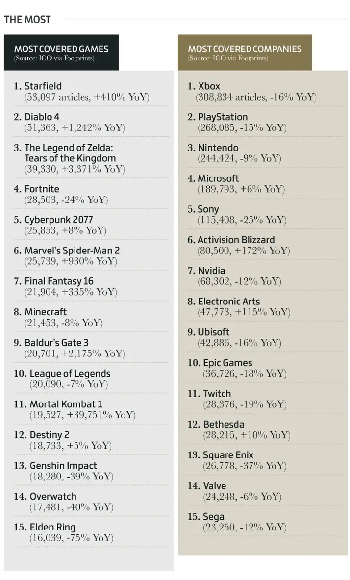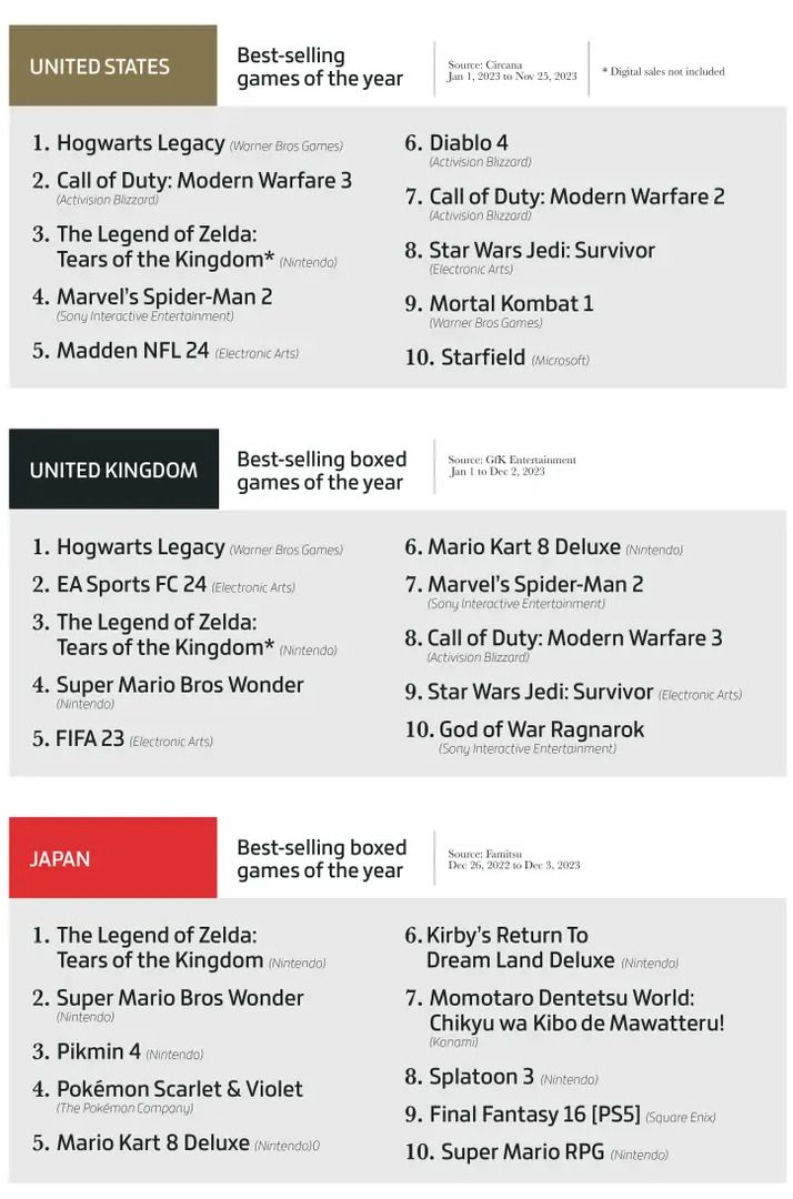 在英国和美国,《霍格沃茨之遗》是销量最高的游戏;在日本,销量最高的游戏是《塞尔达传说:王国之泪》。美国和其他两个市场比较不同,例如《使命召唤20:现代战争3》在该国销量比其他两国都要高,排名第二,而《使命召唤19》甚至依然在美国登入前十;《暗黑破坏神4》和《星空》仅出现在美国前十榜中。