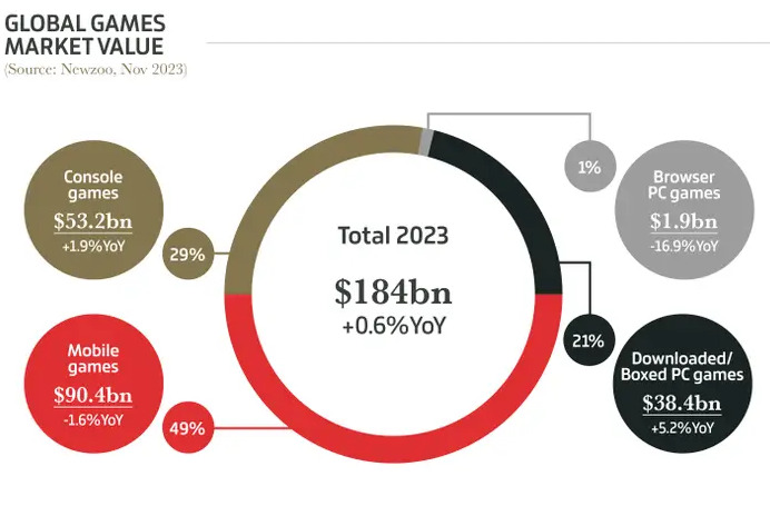 根据统计图限时,游戏行业 2023 年市场总额达到了 1840 亿美元,年同比增长 0.6%。其中手游占比 49%,份额为 904 亿美元;主机游戏份额年占比 29%,为 532 亿美元;数字和实体 PC 游戏占市场份额的 21%,为 384 亿美元。网页游戏份额进一步下降,同比降低了 16.9%,为 19 亿美元。