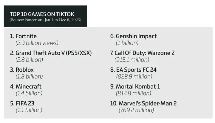 根据话题度排名(Footprints数据),被报道最多的游戏是《星空》,最多的游戏公司是 Xbox。海外抖音 TIKTOK 上最热门的游戏是《堡垒之夜》,第二名是《GTA 5》。而被观看次数最多的预告则毫无悬念的是《GTA 6》的首支预告。