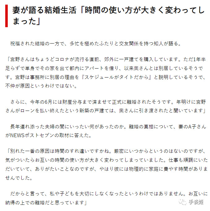 而且报道还说,二人六月就已经完成了财产分割,宫野真守把这栋郊外别墅的贷款还完了,并将别墅给了他的妻子,而即便离婚了,二人的关系变化也不大,宫野真守依然会在繁忙工作的间隙与前妻打电话或见面聊天。