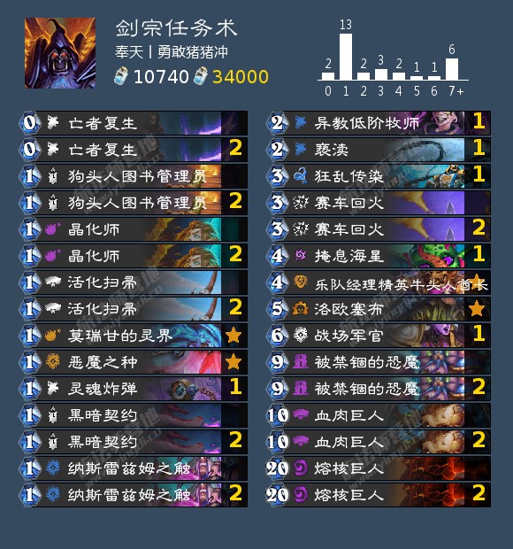来自奉天丨勇敢猪猪冲的招牌卡组剑宗任务术,它的大号使用这套卡组在欧服登顶后挂 机,小号目前在二三十名。