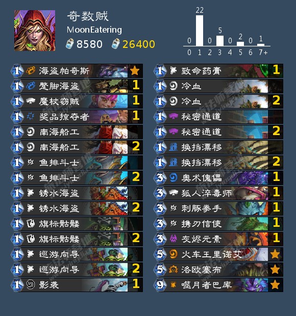 来自MoonEatering(倾柠)的一套奇数贼,它一直在捣鼓巴库、优化打法,使用这套卡组最高打到欧服第25名。