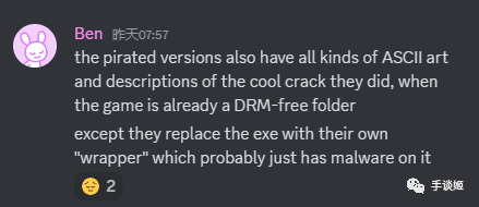 最后开发者表示,尽管对抗盗版似乎很有趣,但是对于自己而言可能会耗费太多无用功,他还是会把更多精力放在游戏开发上,这样对生活才更有意义。