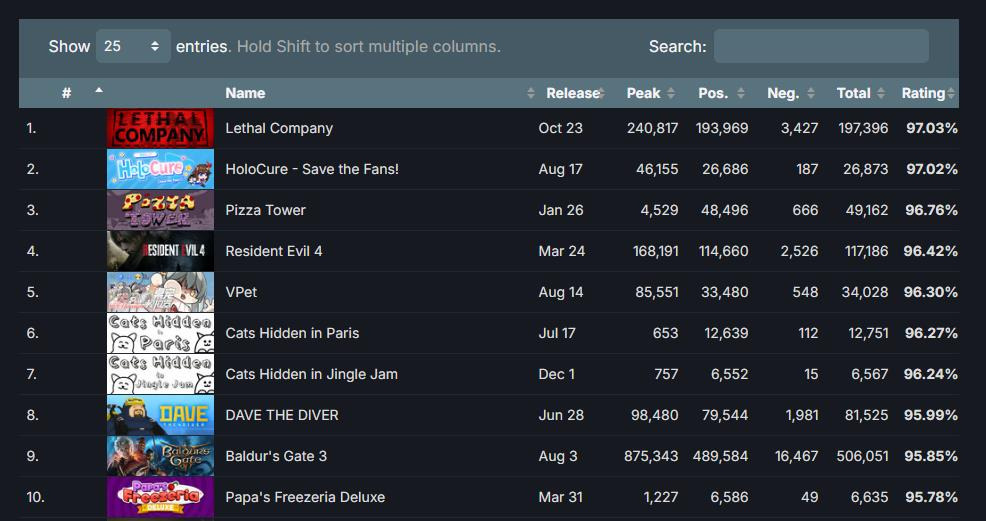数据抓取网站SteamDB根据自己的算法评级评选除了2023年最热Steam游戏榜单,所有数据均来自Steam的游戏评论,合作恐怖游戏《致命公司》获得第一。