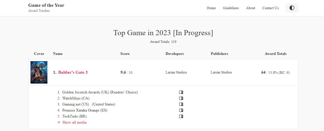 正如上图所示,一个专门追踪游戏及其奖项的网站统计,《博德之门3》共斩获64个年度最佳游戏奖项。这意味着,今年它几乎拿下了所有游戏奖项的54%。紧随其后的是任天堂今年最重磅发布的游戏,《塞尔达传说:王国之泪》,获得了29个奖项,占今年游戏奖项的25%左右。排名第三的是Remedy广受好评的游戏《心灵杀手2》,今年共获得18个奖项,约占15%。