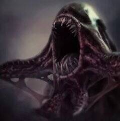 “这个双足怪物后肢类似于两栖类,前肢像恐吓一般高高举起,末端**吸盘的带蹼手掌张开扑向观看者。它的头部是一大团沸腾的伪足或触手,其中可以分辨出一只闪耀的眼睛。”