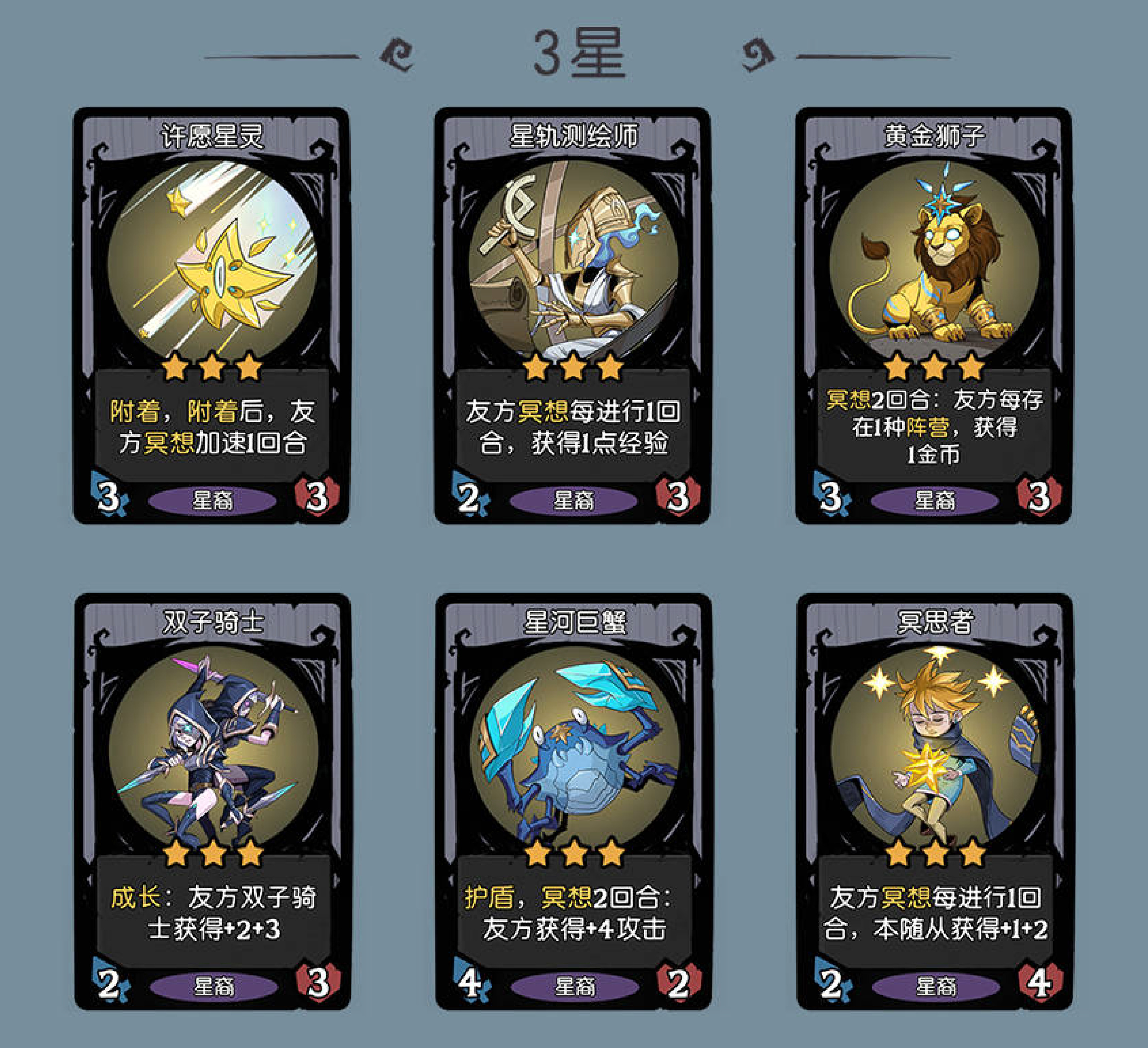 “星裔”和“冥想”是高度相关的,所以先简单聊聊“冥想”吧。“冥想”计数在每回合战斗开始时-1,当计数变为0时,触发“冥想”效果。随从卡牌上显示的冥想X回合,这个X即冥想计数。“冥想”效果触发后,随从失去“冥想”,也就是说“冥想”效果是不会反复触发的(「摩羯之影」例外),“冥想”效果触发后就变白板了。