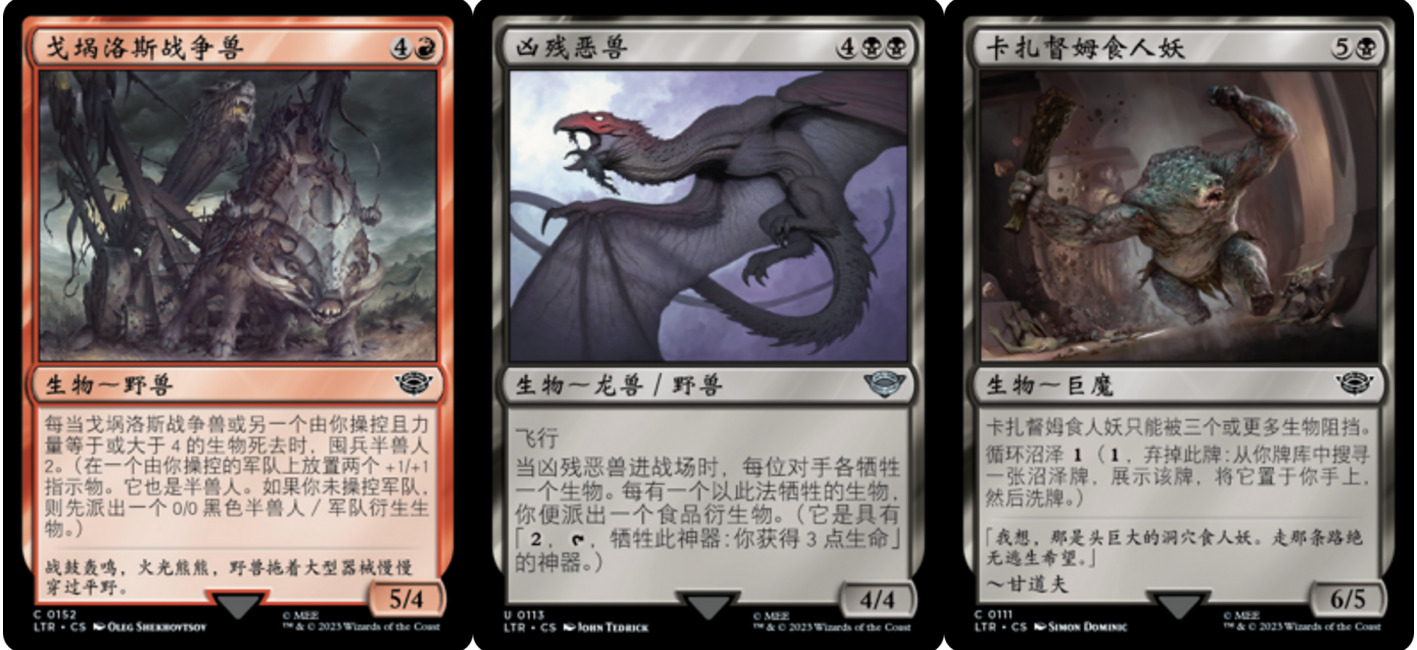 对于高费生物,就需要有更强的场面影响力。魔戒的凶残恶兽、卡扎督姆食人妖是合格的高费生物,而庞巨血口龙 6 费 6/6 践踏放到现在也很普通。现代万智牌对高费生物的要求会更高。
