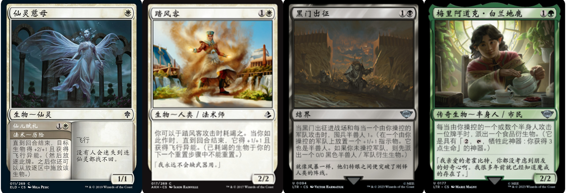 接下来我简短聊聊低费、中费,高费生物的标准。相较于高费生物,低费生物的要求会更宽松。 优质的低费生物需要在游戏的前期和后期都能发挥作用。比如我很喜欢的一张牌,仙灵慈母,在一费回合是合格的小飞机,有机会偷到四五点伤害。在第七回合抓到它可以给四攻生物飞行穿透,同样优秀。类似的还有阿芒凯的踏风客,后期抓到也能给自己穿透。寻路野人在前期是加速人,后期可以提供践踏穿透。