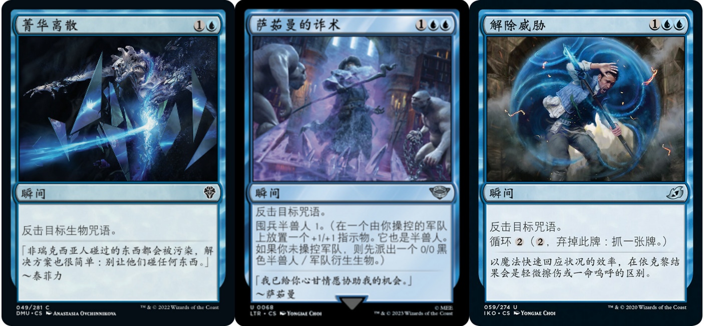 我想再提一下取消变种牌。纯粹的取消是不值 3 费的,稍微给一些正面效果就会很不错,比如萨茹曼的诈术、解除威胁。很多人都意外魔戒中萨茹曼的诈术表现这么好,只是多给了一个 1/1。反击咒语是万智牌的经典标志之一,在限制赛也是可用的,不需要有太多顾虑。