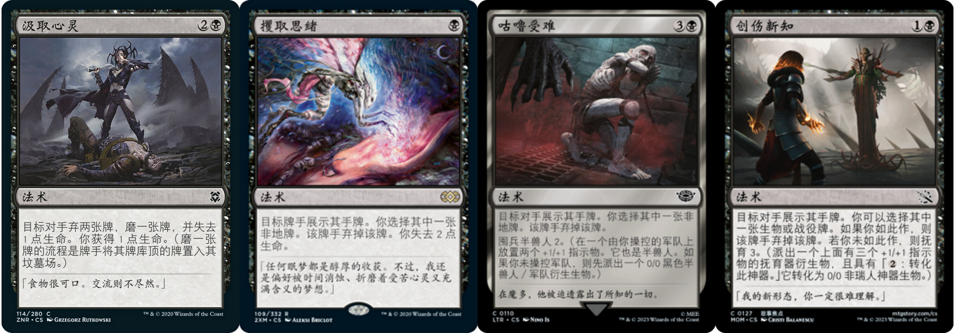 而定点的手牌干扰,比如攫取思绪、咕噜受难。攫取思绪大部分情况我都会放进牌组,逼从的范围太窄就不会考虑。定点手牌干扰除了弃牌还能看对手手牌,你就可以想办法绕开对手的去除用互斗咒语。像创伤新知这样如果你没有想弃的牌,保底也是个 4 费 3/3,也是张不错的牌。以往逼从这样的牌在限制赛的效果太差,以至于很多人对定点手牌干扰的评价一直不高,带身材/范围广/灵活度高的弃牌咒语是可用的。