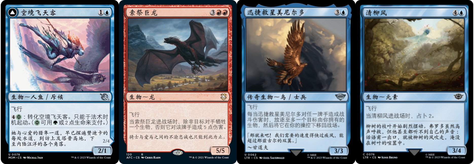 飞行被普遍认为是很不错的关键字异能,这某种程度上是正确的。但是就像其他异能一样,有优秀的飞行生物也有糟糕的。优秀的飞行生物通常廉价高效,你可以早早拍下开始抢血,像空境飞天客的效率就很棒。到了 3 费 2/2 风龙兽就算不上好身材了。再大一些的飞行大哥,比如凶残恶兽、索祭巨龙一般也是很好用的。