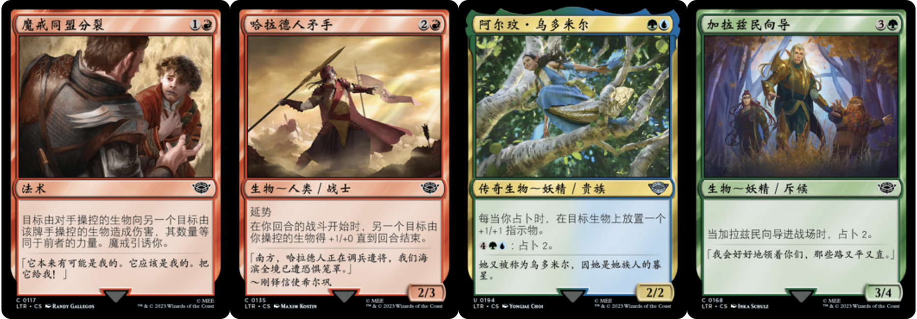总体而言很多系列每个颜色能创造最多价值的生物都是 ETB 生物。我想这也是绿色为什么长期弱势的原因。设计师似乎有意不把优质的 ETB 效应印给绿色,上一次特别出彩的还是萨茹夫的狼伴。就像魔戒就没有特别好的绿色 ETB 生物,没有能企及红色黑色,甚至蓝色的。这是魔戒绿色弱势很重要的原因之一。我频道里有个朋友想组纯铁 cube 或者银铁 cube ,他发现绿色生物很难挑出满意的,因为绿色很少印优质的 ETB 生物。
