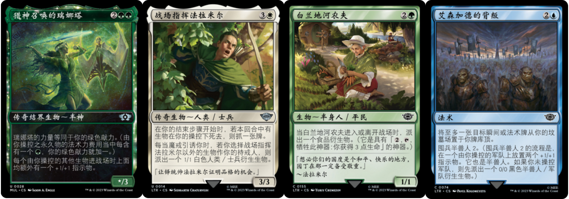 有很多“陷阱牌”都能被划到这个分类,猎神召唤的瑞娜塔在邪军压境就被过分高估了,它看起来不错,能给后续的生物加豆,但四费下它存在着很大的风险。究其原因它是 4 费 X/3,不擅长阻挡,并且你希望它撑到下一个重置阶段开始产生价值。所以对手能很轻松地选择进攻施压。类似的例子还有战场指挥法拉米尔,如果进场就能触发异能的话会很不错,但很多时候是被迫裸下的,那就只是一个 3/3 白板,而且你还不愿意拿来参与攻防交换。其实这就是你输掉对局的开端,你的 3 费 4 费生物没方法阻挡早期小生物。再看白兰地河农夫,效应 vs 身材的经典例子。你遮掉身材只看它的文本,会觉得挺不错的,但一看身材只有 1/1。它身材改成 2/3 或者 3/2 完全是张好牌。部分玩家会过于重视效果,想着我能拿食物打出什么样的配合,忽视了身材的重要性。同样地,艾森加德的背叛改成囤兵 3 会特别厉害,但 3 费 2/2 就立刻缺少了吸引力,即便我有甘道夫之罚也会尽量避免它入主,因为身材上太差了。