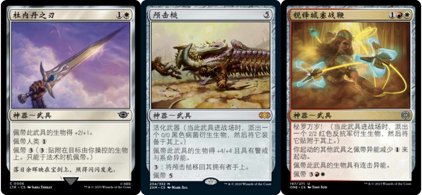 这里主要讲的是武具,如今万智牌出了很多种变种牌,想让武具变得更可用。大部分的武具我觉得并不好用,因为武具是一个很容易做崩的类别。如果印强了,让所有的生物能以廉价费用变大或者有强力异能,太破坏平衡;如果印弱了,自然也没有人想用它。而且武具一直以来都是需要其他牌(生物)配合的类别。在武具套牌里,生物数量通常要在 16 张左右。而且你抓到武具,对手把你的生物解掉之后,你的武具就是张废牌。最好的武具是像活化武器或者万界归一的秘罗万岁!这样自带身材的武具,它解决了武具的主要问题。大部分情况下,考虑武具都需要往糟糕的情况想。偶尔会有优质武具出现,比如钢梁镇殴击棍,金脉镐,它们可以不停造珍宝,值回它们的费用。即便像杜内丹之刃看上去很扎实的武具,1 费佩戴,+2/+1,也堪堪是可用的水平,不应该放进大部分牌组。