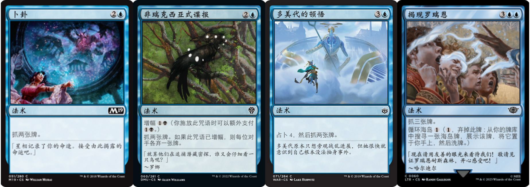 很长一段时间里,卜卦是三费抓二咒语的参照物。在过去卜卦是一张不错的牌,如今它最好能满足一些条件就减费(翼散良言),或者给一些添头(非瑞克西亚式谍报)。如果法术力费用能拆开支付的话,2023 年的卜卦可能值 2.75 费。至于抓三张牌,通常是五费,我现在也觉得实际价值在 4.5 费。在不少系列五费抓三过于笨重,因为很难找到时机花整个回合抓三张牌。魔戒的节奏没有那么紧张,揭现罗瑞恩便是一张好牌,五费抓三附带循环找地。四费处在中间的位置,所以会给占卜之类的效果(阿尔玟的赠礼、多美代的顿悟)因为抓三的实际费用在四费到五费之间,所以四费会印一些带滤牌效果的抓二。