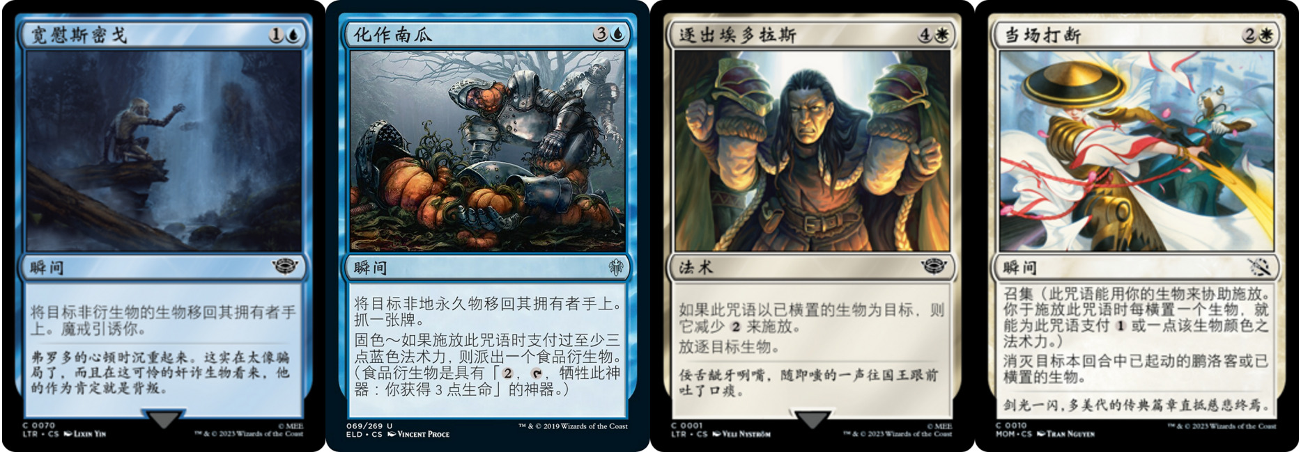 宽慰斯密戈和反召唤这样的弹相比在控制思路,更适合进攻思路,两费三费四费顺拍,弹掉对手的四费生物然后宣攻,节奏很丝滑。虽然对手的生物可以重新下,但在此之前,我们已经踢了对手很多血。在控制卡组里,我不会想要很多张纯粹的回手咒语。如果有很多手牌补充手段,亏牌的问题得以缓解的话,可以带一张回手。