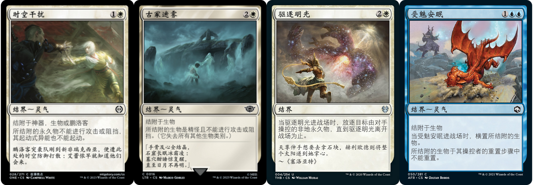 白色蓝色有很多结界类的去除,你可能看到过我和其他内容创作者对这类牌评价都会预期偏低一些。结界类去除并非不可用,只是普遍存在一些问题。时空干扰和古冢迷雾这样类和平主义的牌,通常不能阻止触发式异能和静止式异能,有些连起动式异能都不能阻止。对手有很多方式再利用被贴皮的生物,牺牲、云移或者回手。但时空干扰作为两费牌已经很高效了,而古冢迷雾笨重很多。