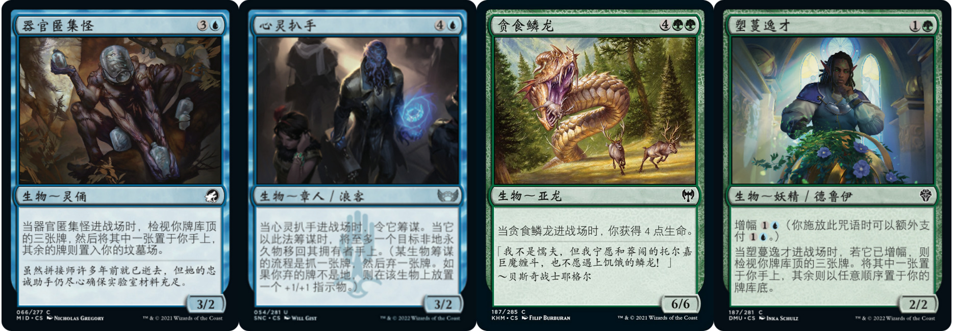 当然身材也不是一切,优质的进场效应可以补足身材的亏模。到了 2023 年的限制赛,往往是 ETB 生物表现最出色。比如抽牌(器官匿集怪、励志监管使、萨茹夫的狼伴)或者进场杀一个怪/弹一个怪(心灵扒手),回血(贪食鳞龙)。不过像 DMU 的塑蔓逸才,好的 ETB 也无法掩盖身材,即便能抓牌也只是 4 费 2/2。器官匿集怪的 3/2 也能交换很多生物。如果你的身材太小了,赚不回一张牌的话也算不上一换二了。