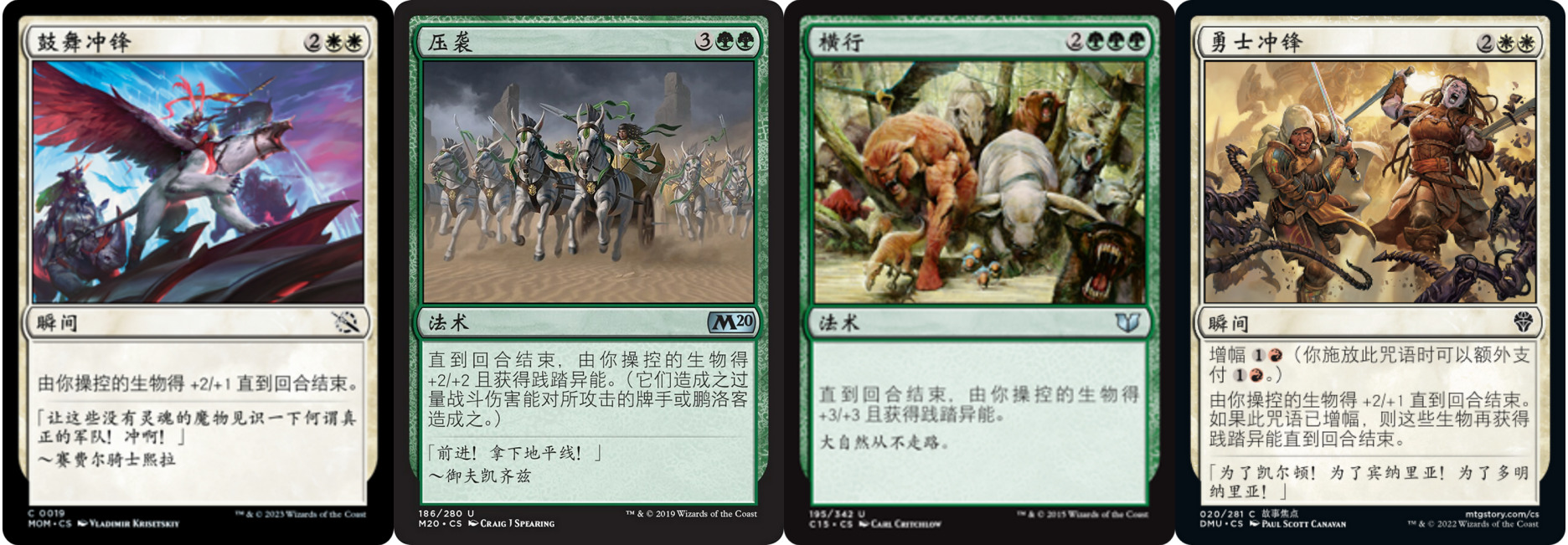 在邪军压境有鼓舞冲锋这样的群体膨胀咒语,之前还印过压袭。有些人认为压袭会再现横行的辉煌,但实际上两者强度差距很大。+3/+3,即便你场面上生物不是很多,你还是能靠它终结比赛,或者逼迫对手拿所有的生物阻挡。而 +2/+2,一个数字的改动就会引发很大变化,压袭的实际表现并不如人意。在 2023 年,横行过于亮眼的表现仍然会影响我们对群体膨胀的评价。最近一次群体膨胀好用的系列在多明,有很多造衍生物的生物和法术,红白铺场用勇士冲锋是成立的。而且它增幅还带践踏。