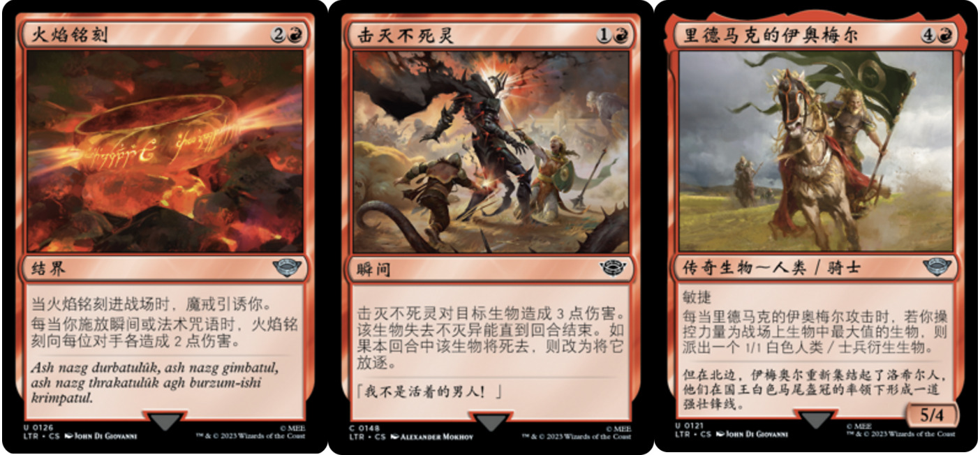 比如在火焰铭刻和击灭不死灵之间比较的话,我会优先考虑结界,因为魔戒这个系列红蓝很强,我很有把握组出一套 12、13 张法术瞬间的套牌,发挥出火焰铭刻的上限。而在法术瞬间数量只有 8、9 张的套牌里,2 费打 3 显然会发挥更好。