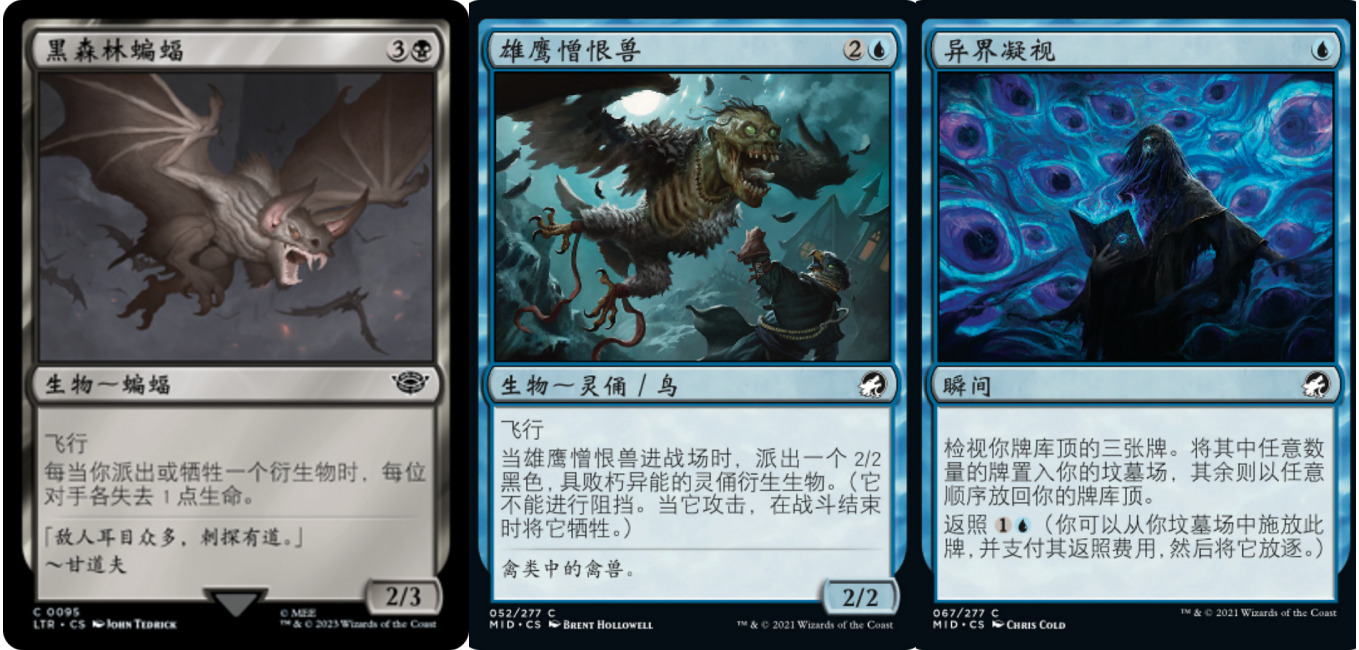 这期栏目并非旨在挖掘一张牌某些厉害的场合,也不会涉及由于低抓位而上调评价的情况。今天的重点会放在评估基准线上,让你对花多少费能干多少事有基础的印象。这样就能知道对于亏身材的牌需要何种程度的机制回报,让它值得入主。这也是万智牌有趣之处,不是一味地挑出超模牌就能取胜。比如异界凝视自己赚不回一张牌,如果有足够多的惊扰返照牌配合的话,才有机会变成潜在的三费抓二/抓三,雄鹰憎恨兽是相对更超模的一张牌。如果你牌组达到了门槛,用出异界凝视的上限,让机制回报抵过强度亏损,自然是可以在两者之间选异界凝视。