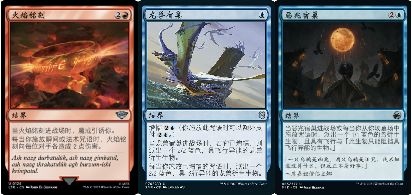 最后聊一下需要围绕构筑的牌,大部分是结界。这类牌如果自己能先创造一些价值,或者是对后续启动有帮助的话,就有潜力成为好牌。比如火焰铭刻的魔戒引诱,魔戒的抓弃效果能帮忙滤到法术瞬间牌,龙兽宿巢和恶兆宿巢都能先给你造一个生物出来。当然这类牌还有很多需要考量的地方,篇幅有限,就先提这一个小点。