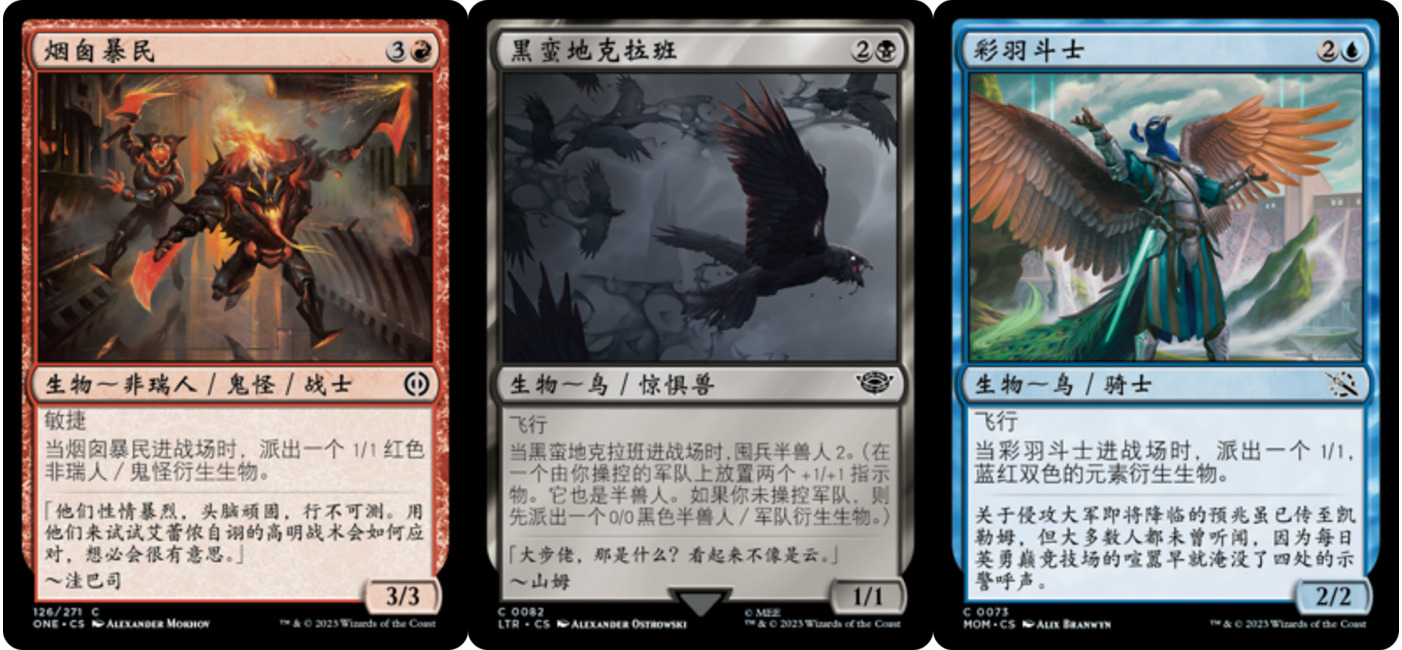 前面提到了通过白板测试的生物不错,带 ETB 的生物不错,还有一类重要的 ETB 我没提到,那就是能造衍生物的生物,例如烟囱暴民、黑蛮地卡拉班、彩羽斗士。这些在各个系列发光发热的牌证明了自己的强度。因为这类牌很灵活,你可以用一个进攻,另一个阻挡;也利好牺牲配合。面对猛烈进攻的对手时,它可以提供了多个阻挡点,让对手的去除变差了。同理你进攻时它铺开场面,也会让对手的去除变差。所以下次看到能造衍生物的牌的时候可以多留心一下,它可能是一张好牌。烟囱暴民在万界归一的时候就被严重低估了。