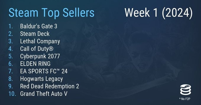 Steam最新一周销量榜出炉(2023年12月26日-2024年1月2日),本周《博德之门3》再次登顶,达成二连冠,《GTA5》也再次上榜,排名第10。
