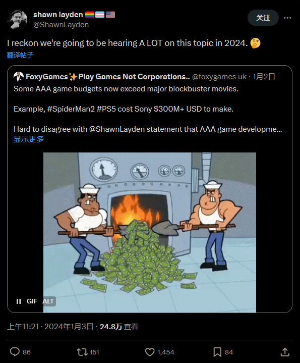 近日,前索尼互动娱乐(SIE)首席执行官 Shawn Layden 转发了一条讨论上个月索尼第一方工作室 Isomniac Games 黑客攻击事件中泄露信息的推文。这条推文讨论了《漫威蜘蛛侠2》制作成本超过 3 亿美元的消息。他在转发的回应中表示,他认为在 2024 年我们将听到更多有关不断上升的游戏开发成本的讨论。