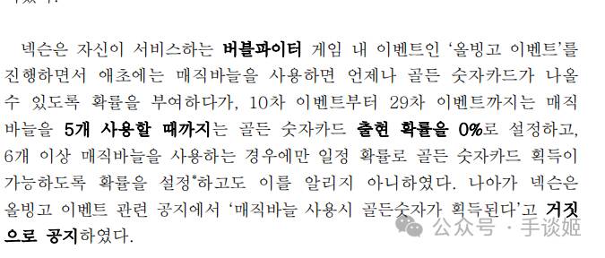 报告如此写到:“NEXON在游戏内搞All Bingo活动时,最初设定使用魔法针有概率开出黄金推进器(一种可以增加游戏角色奔跑速度的装备),可从第10次活动到第29次活动时,前5次使用魔法针将不可能开出黄金推进器,只有使用6个以上魔法针的情况下,才能以一定概率获得黄金推进器,NEXON没有告知用户这一情况。”