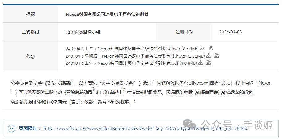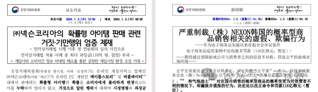 原来,2024年1月3日,韩国公正交易委员会(Korea Fair Trade Commission)发布调查报告,称在2010至2021年期间,NEXON多次修改《冒险岛》以及《泡泡战士》的道具概率,却未告知用户,有用户欺诈行为,所以对其做出了116亿韩元的处罚。