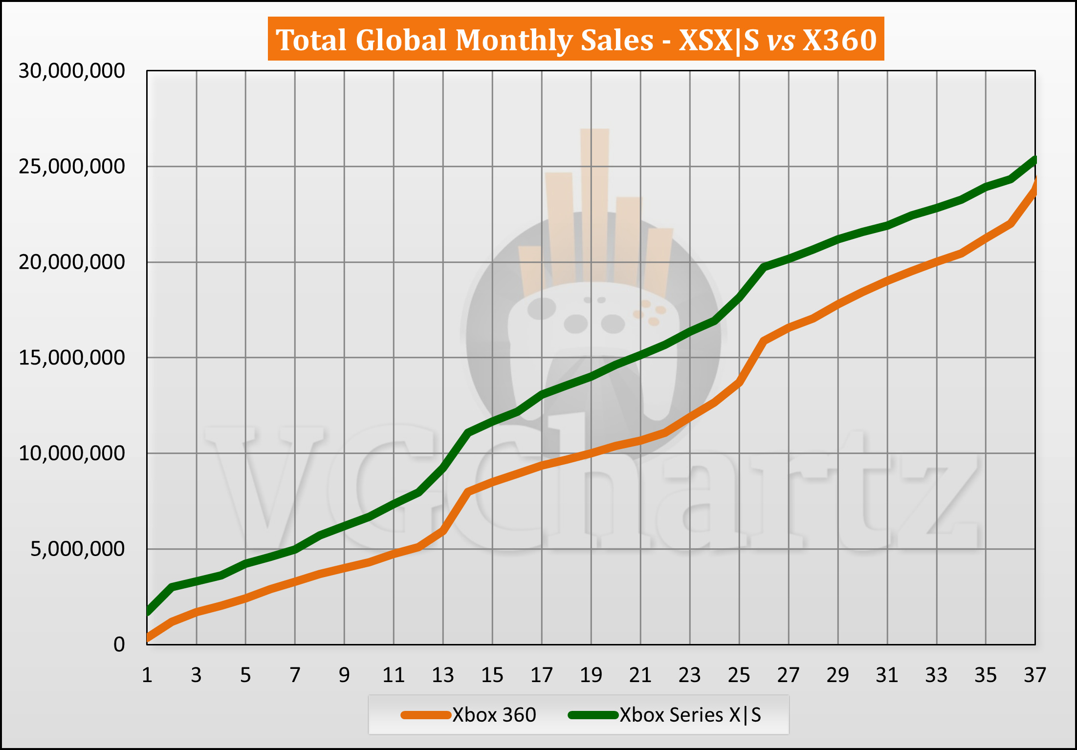 37个月的时间里,Xbox Series X|S卖出25,373,618台,而Xbox 360在上市37个月时卖出23,740,224台。