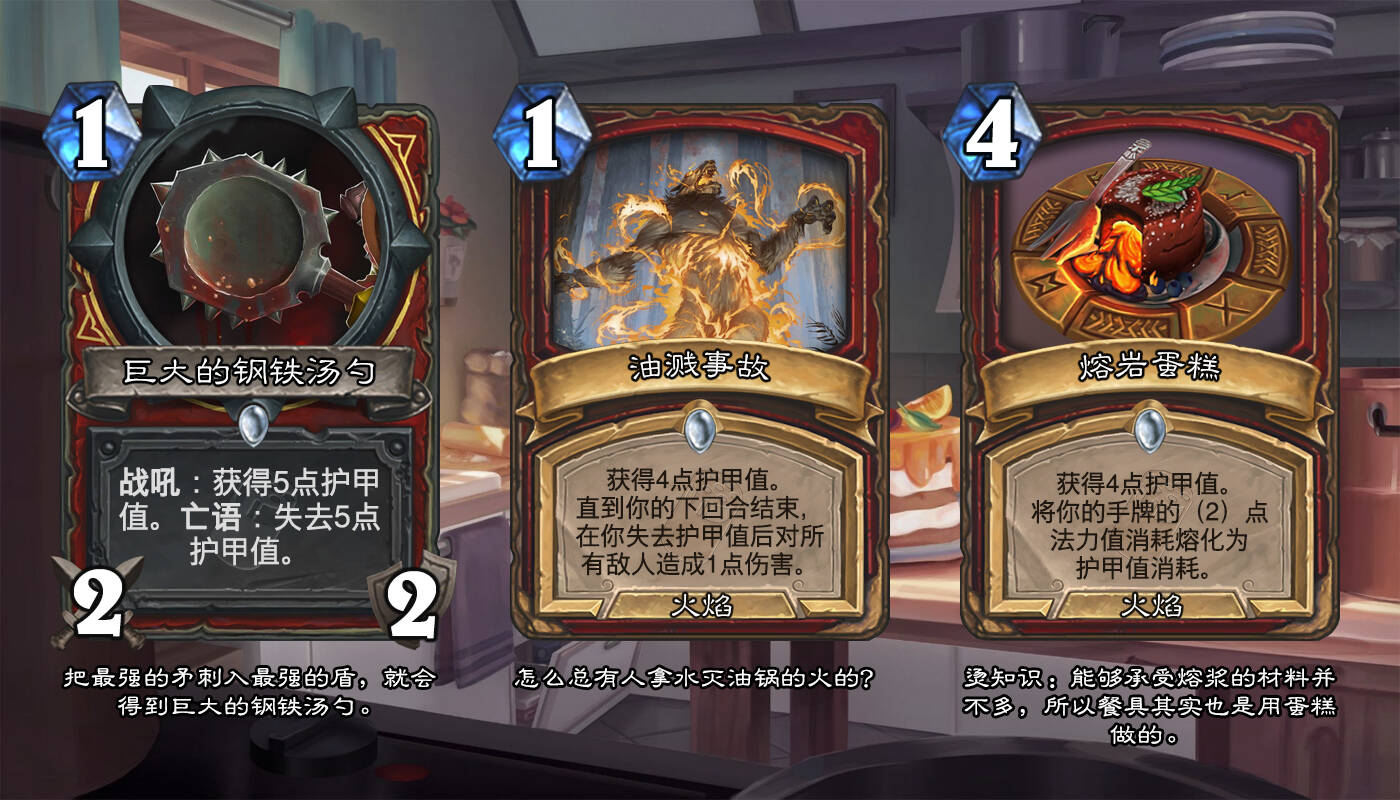 熔岩蛋糕提供的护甲值消耗显示在法力值消耗旁边,你无法在护甲值不足时使用这些卡牌。