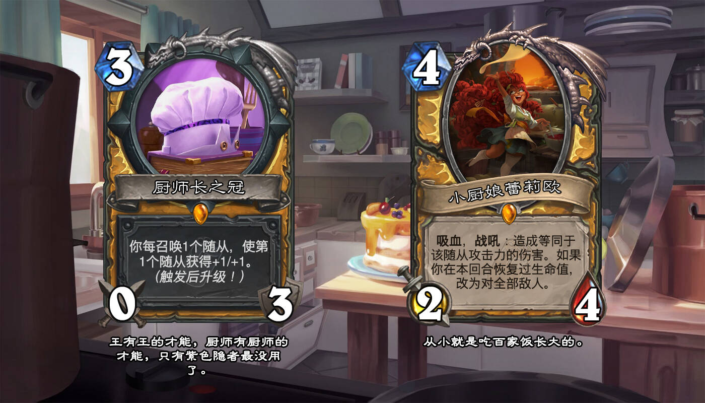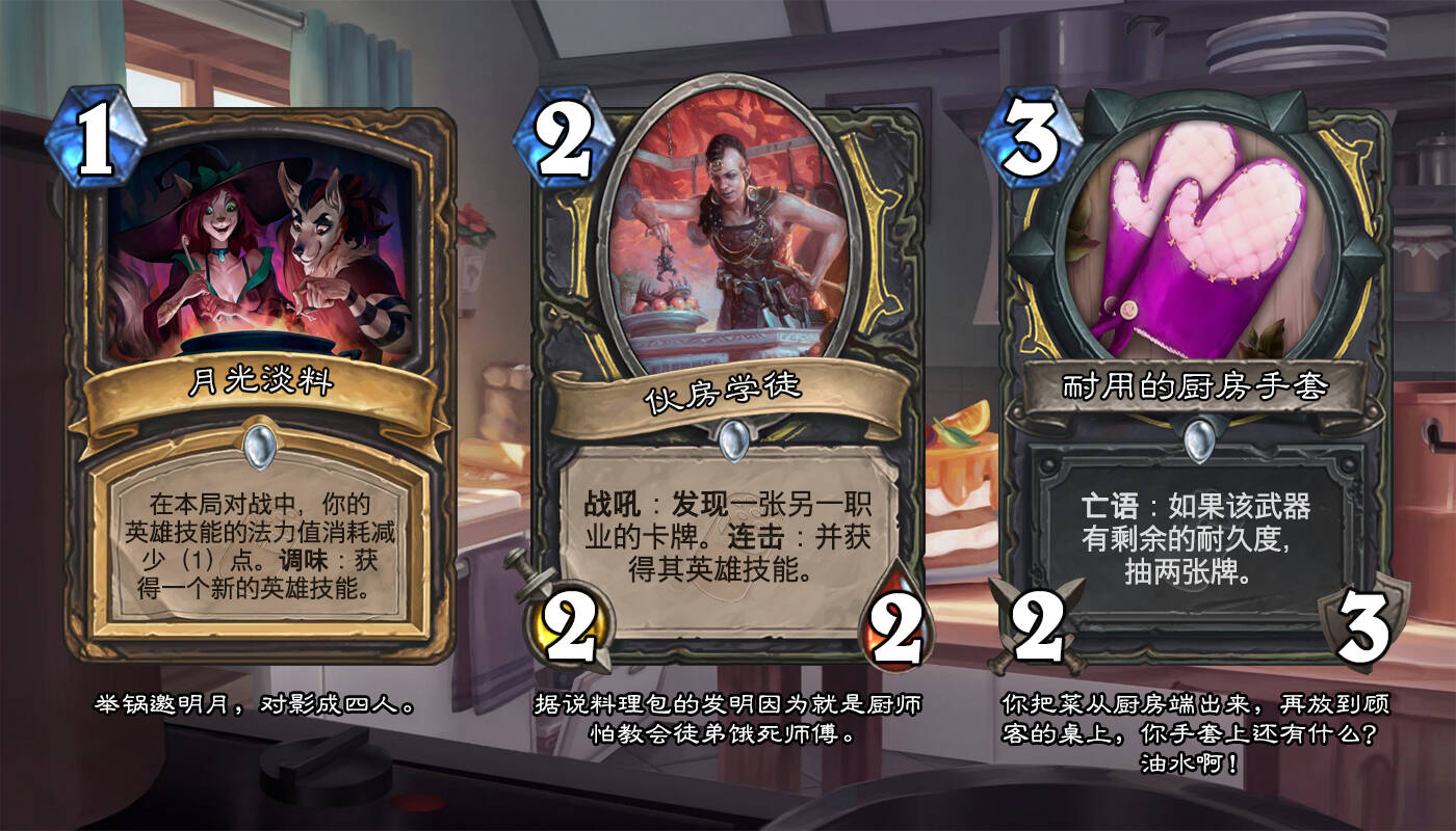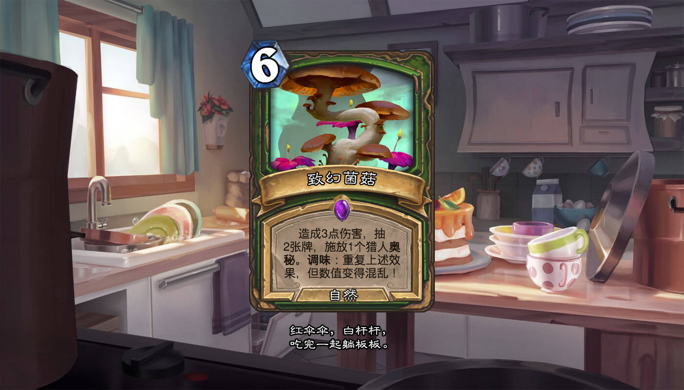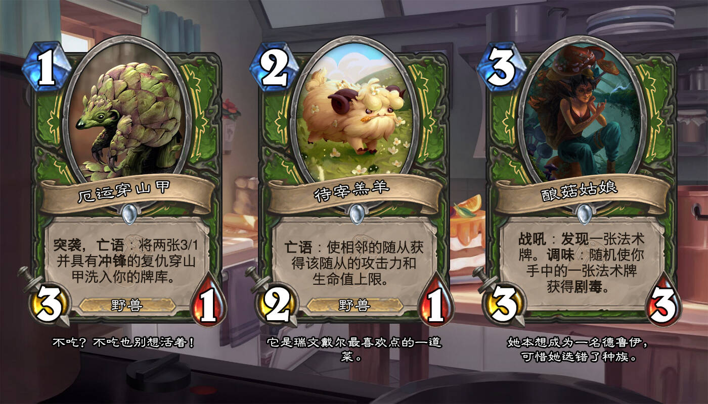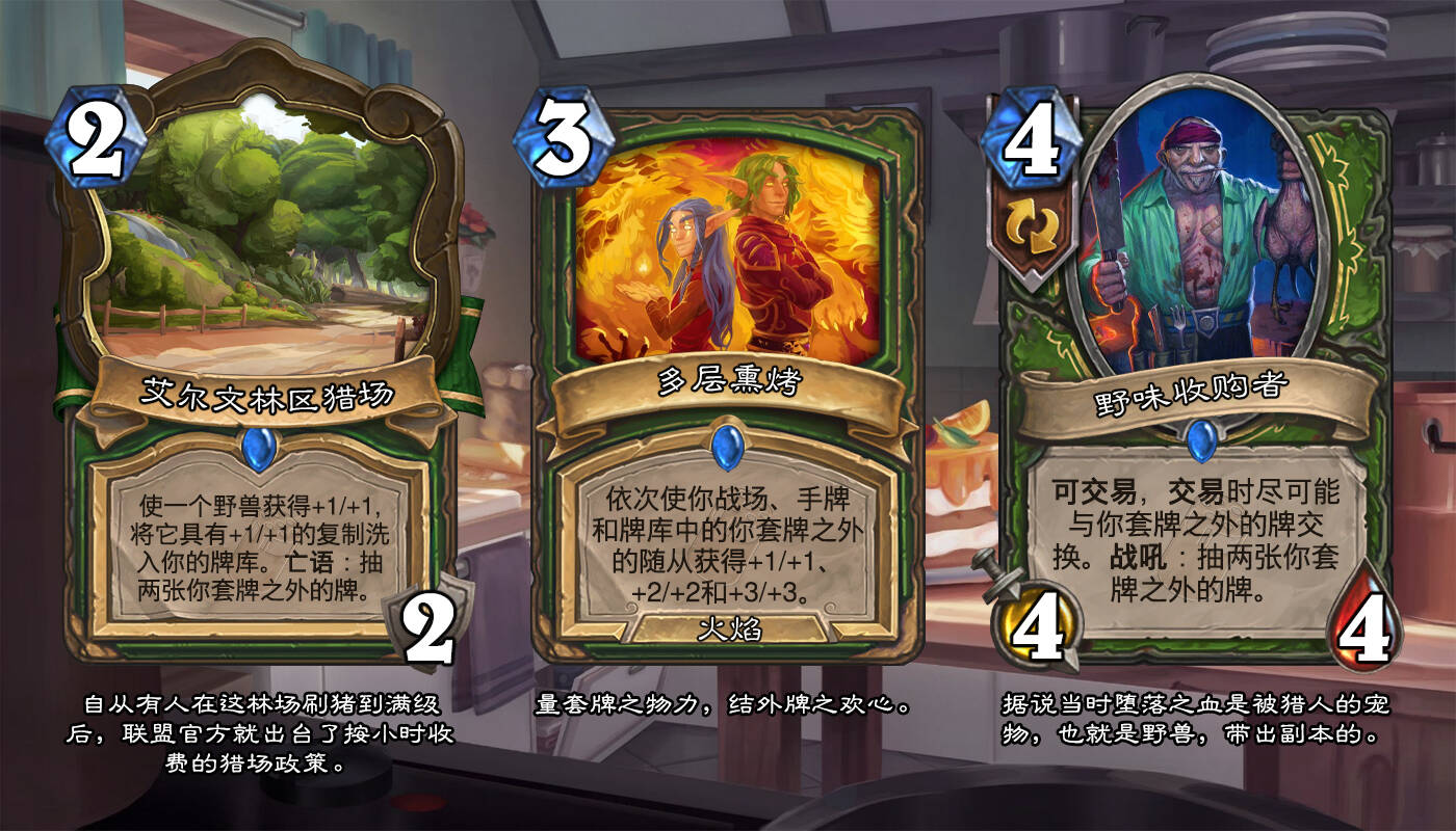 猎人可不愿意把自家心爱的野兽伙伴做成菜肴,所以他们选择烹饪这些套牌之外的狩猎所得。裹上面包糠炸至焦脆金黄,敌方英雄的生命值都要馋哭了!