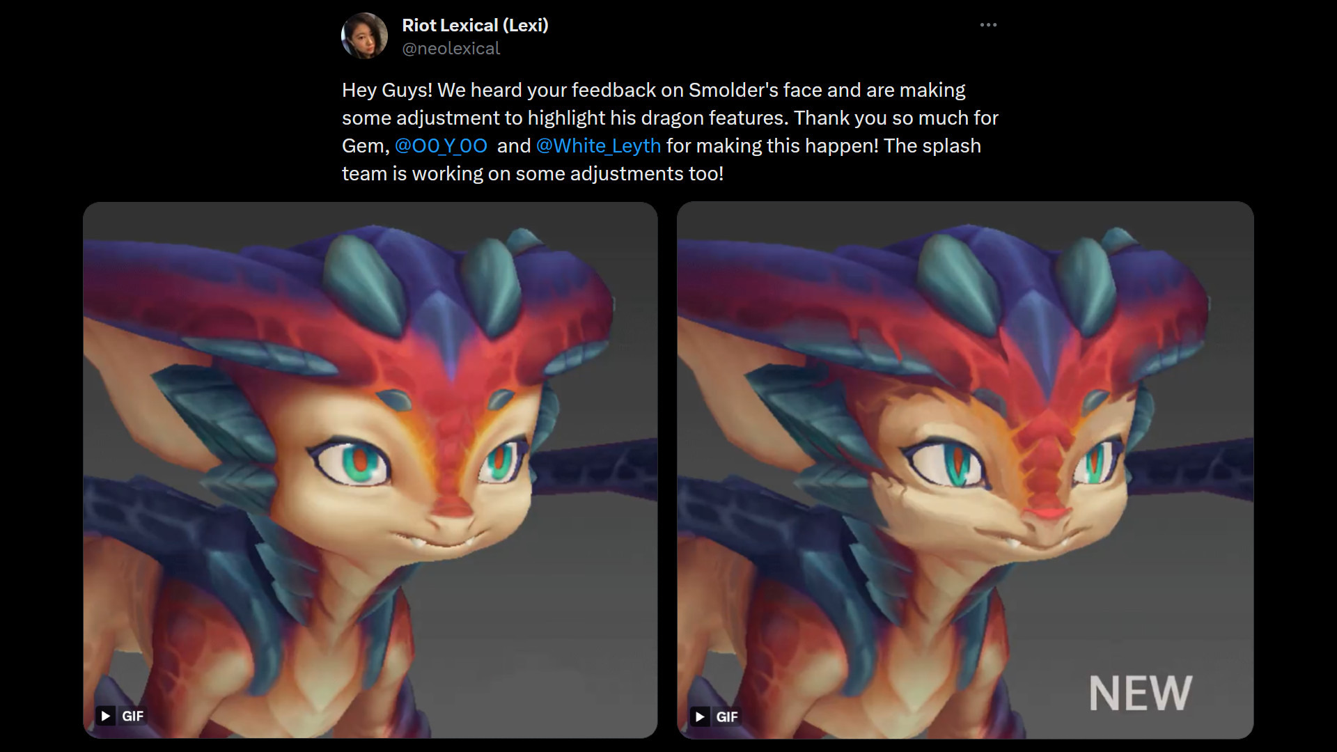 而拳头的产品经理“neolexical”也在推特上进行了回复,表示正在针对斯莫德的脸部进行调整,并且放出了对比动图。