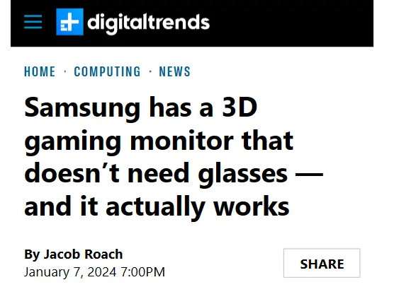 电子巨头三星今日在 CES 2024 上宣布正在开发一款支持裸眼 3D 的游戏显示器,外媒 Digital Trends 对概念版进行了上手体验。