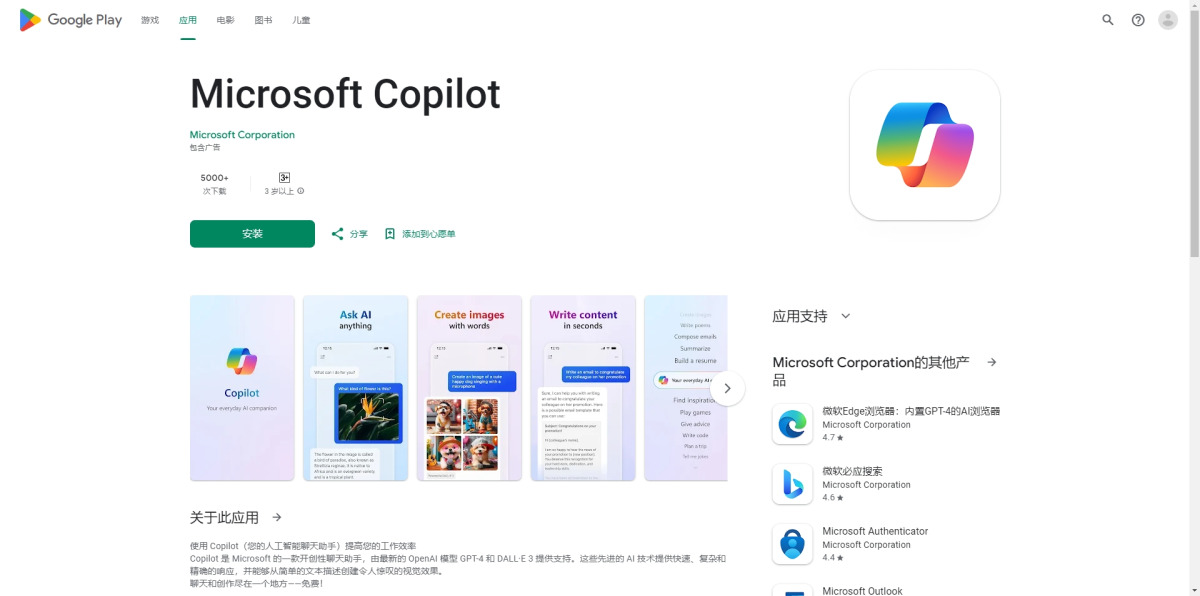 目前Microsoft Copilot在谷歌商店的累计下载次数已有5000+,但iOS版本的Microsoft Copilot尚未上线。