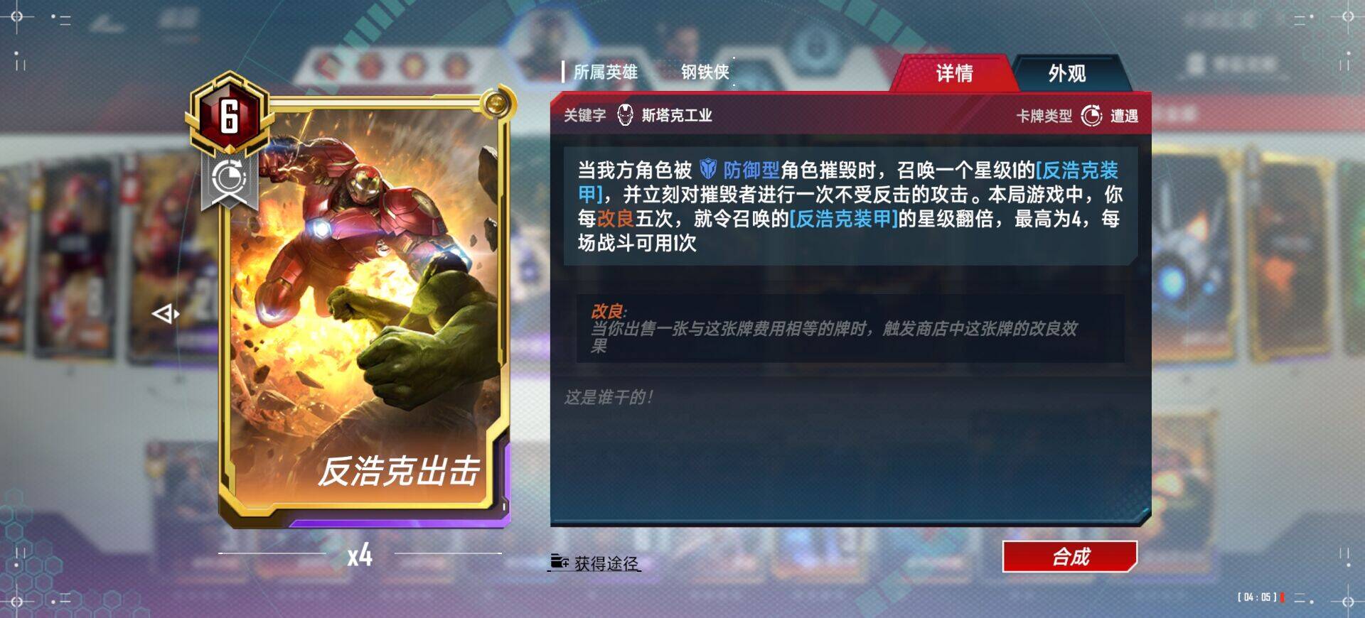 反浩克出击:这张卡主要是为了双方都被迷境魔变掉后反浩克会跳出来给对面一拳。只有被扭曲扭到1至2费再拿,否则不要动它。