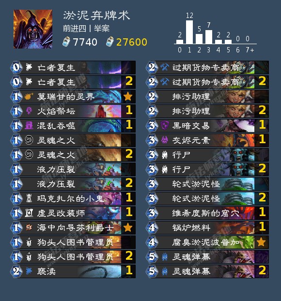 对阵如德鲁伊等慢速,起手不要留淤泥怪, 需要借助过期货物专卖商、亡者复生来反复刷灵魂弹幕,把伤害最大化,所以不要滤牌太快,牌库太少会降低总回合数。