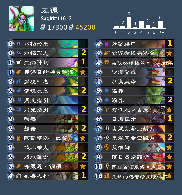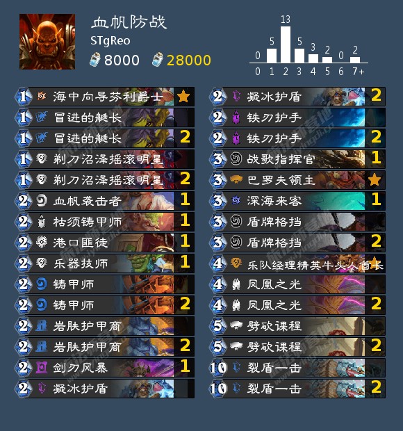 注:正常的德鲁伊由于可以叠甲拖慢红龙贼启动,至少不会大劣。由于我这套优化了凶猛咆哮并且只带了一张分叉,没有叠甲手段,红龙贼32或者48斩完全够用,因此是大劣。对阵战吼萨只输反复锁晶/无限孤单雷诺,中期注意争夺场面,让对手不方便下魔精大师兹伊希,撼世者必须解。