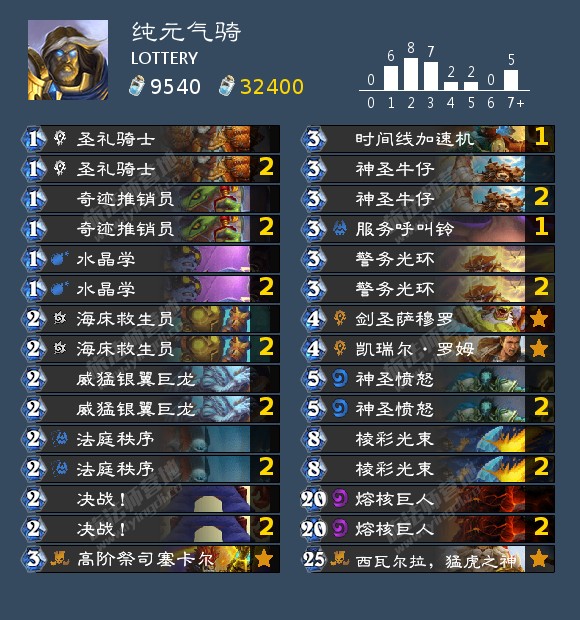 劣势对局:法师的苟活牌很多,而且这套纯元气骑没有带针对牌,不好打;德鲁伊能跳费叠甲我们不如对面快;战士这个对局数量较少,但理论上也是劣势。