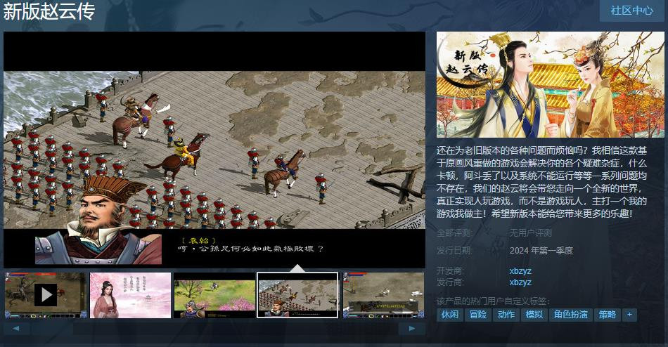 今日(1月3日),经典游戏重制《新版赵云传》Steam页面上线,预计于今年第一季度上线,感兴趣的玩家可以点击此处进入商店页面。