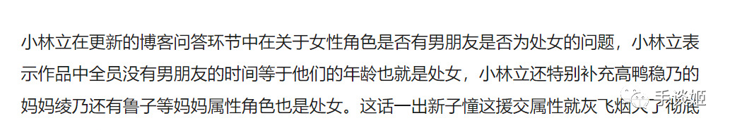 如果你说这太离谱了反常识不能接受,那么手谈姬表示理解,不同作品的目标受众就是不一样的。“master love精神策源地”yy小说吧还会觉得大龄女友有过前男友(早逝)是违反其精神洁癖的呢。但在手谈姬看来,作者已经非常尽力地去维护这种极度理想的恋爱关系了,比如本季动画最后一位女朋友,羽香里的妈妈羽羽里,就是人工**的方式生下孩子的,作者这么设置,明显就是为了照顾他心目中那群读者的感受嘛,就令人想起小林立当年的“全员处”的设定了。