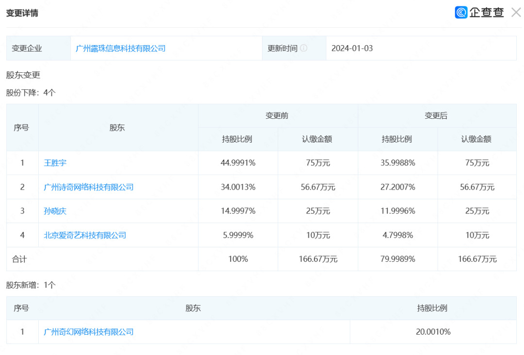 企查查近日显示,露珠游戏在12月刚刚获得了一笔新投资,来自广州奇幻网络科技有限公司,占股约20%,后者是诗悦网络的子公司。爱奇艺的股份因此下降至了约4.8%,另一外部股东广州诗奇网络科技有限公司(由两自然人持股)的股份下降至约27.2%。