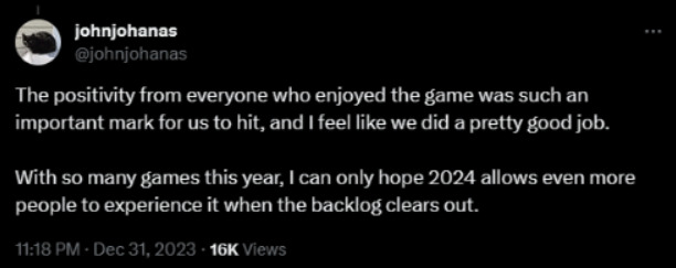 去年年底该游戏的总监John Johanas在推特上表示,一旦完成了积压的工作,他希望能在2024年让更多的人体验这款游戏。