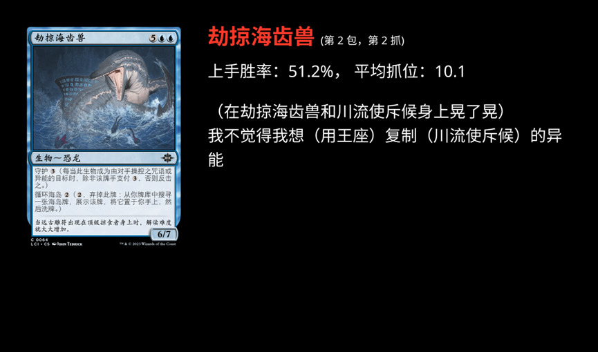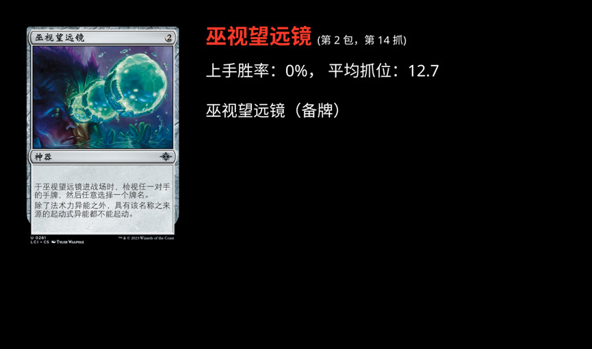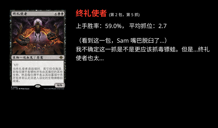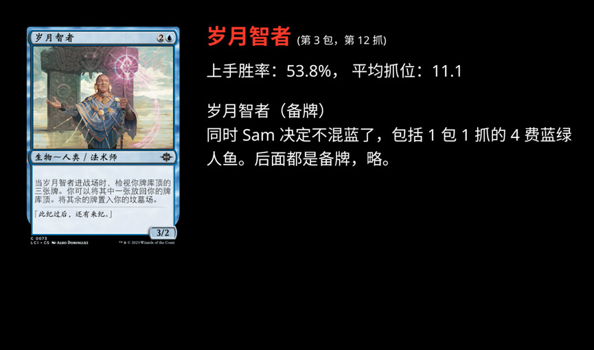 这场轮抓 Sam Black 在 Twitch 上进行了直播,也有直播录像。同时他也使用了 17 Lands 做了记录。所以我们可以进行很完整的回顾。
