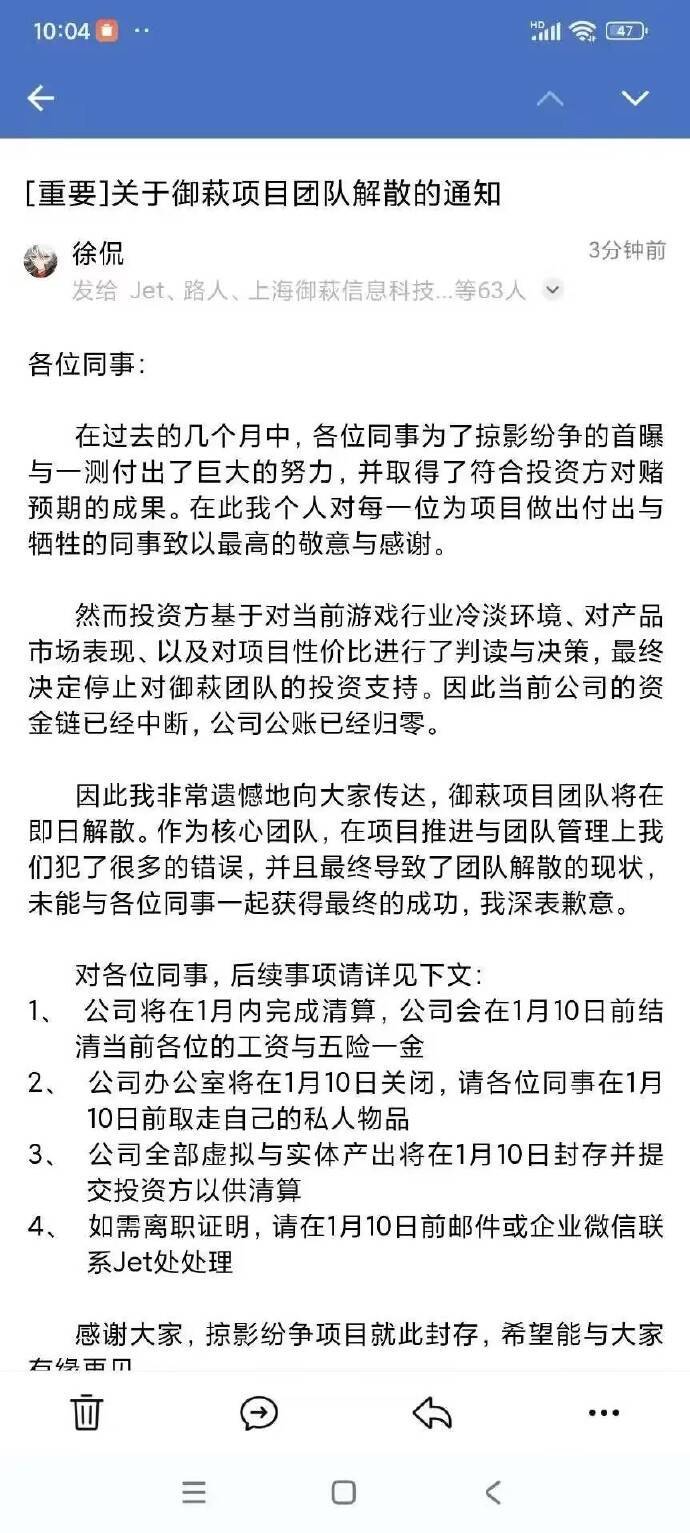 在距离项目团队解散的一周前,《掠影纷争》还进行过为期三天的小范围测试,创始人徐侃在邮件提到测试取得了符合投资方对赌预期的成果,但最终还是没能继续得到投资方的支持。